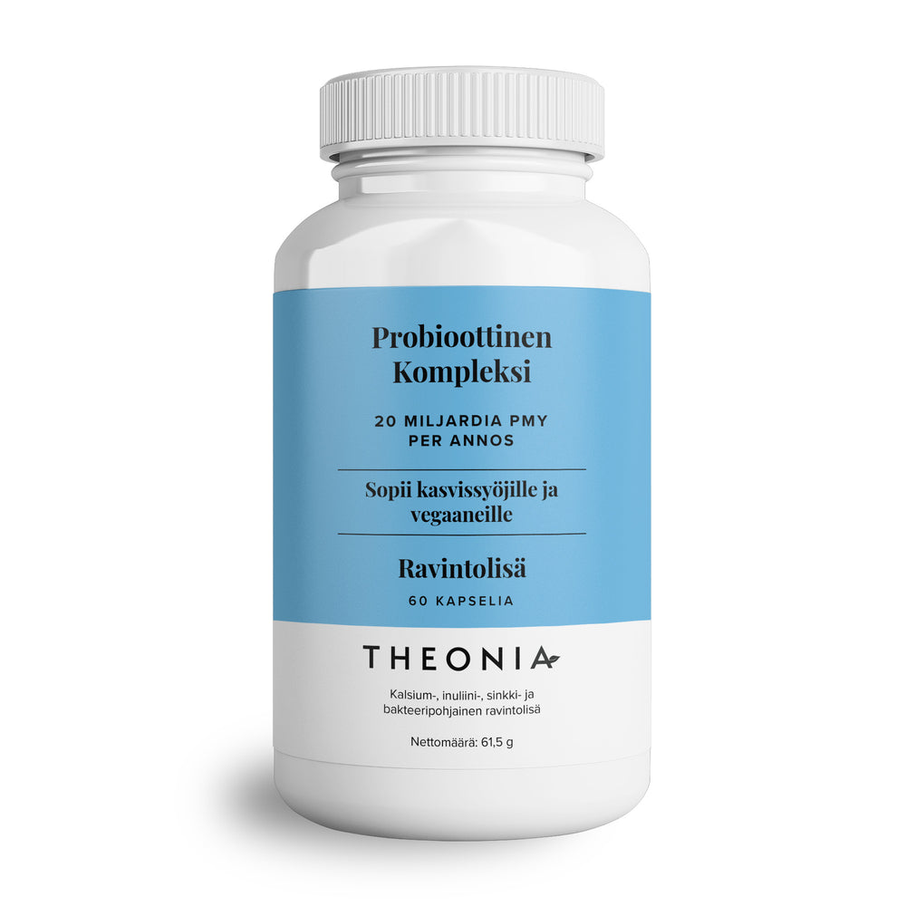 Me Theonialla uskomme laadun päihittävän määrän, minkä vuoksi Probiootti Complex sisältää vain korkealaatuisimpia bakteerikantoja ammattilaisten suosittelemissa annoksissa. Jokainen annos sisältää 20 miljardia PMY:tä seitsemästä eri probioottikannasta, joiden on kliinisesti todistettu toimivan.